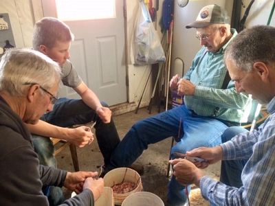 One of our traditions is that we get together to clean Rocky Mountain Oysters after our brandings. It's a great time to relax and listen to stories from long ago.