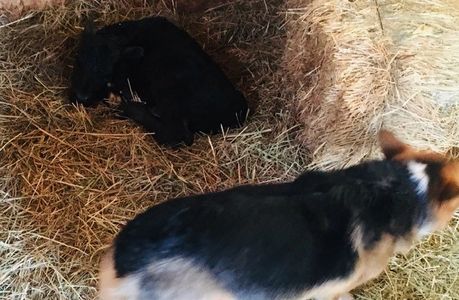 Our itty bitty twin needed a little playtime between feedings, but I'm not sure Manny the Corgi appreciated his antics!! There's never a dull moment during calving season!